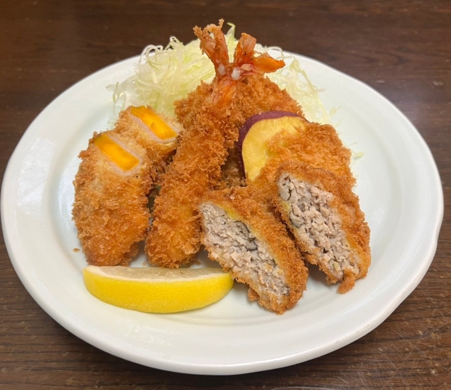 一口かつ、海老フライ さつまいも揚げ、カボチャ肉巻揚げ きのこメンチカツ (特定原材料等28品目:小麦.卵.乳成分.えび.大豆.豚肉.鶏肉)