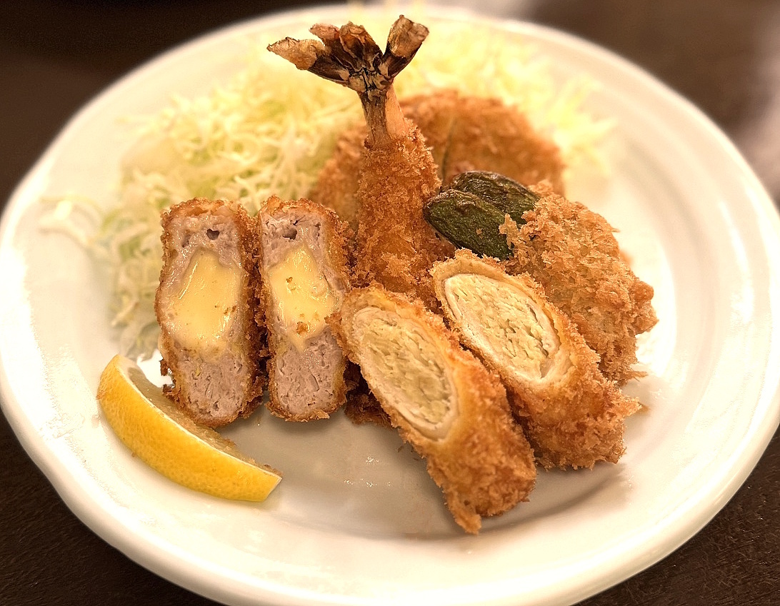 一口かつ、海老フライ ショウガの鶏肉巻、スナップエンドウの豚バラ巻 チーズメンチカツ (特定原材料等28品目:小麦.卵.乳成分.えび.大豆.豚肉.鶏肉)
